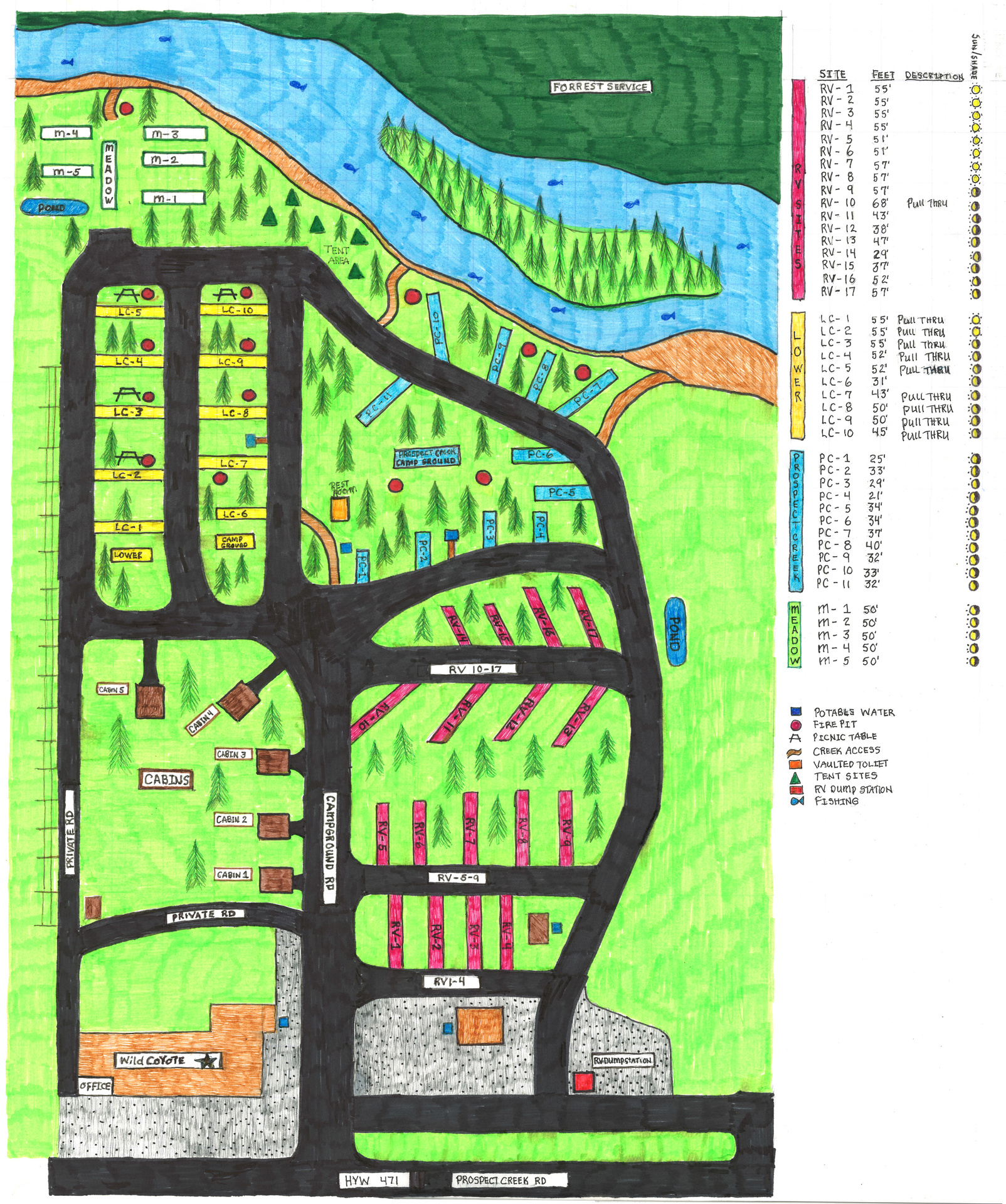 Choosing the right location for your stay can be stressful! Let us help you find your perfect spot. Potable water is available for all campers and a dump station. Please adhere to quiet hours, after 10:00 pm for running generators. Check in at the office next to the Wild Coyote Saloon. Check out 11:00am and check in 1:00pm. Arriving early? Call ahead for verification.